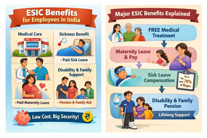 ESIC provides medical care, sickness benefit, maternity benefit, disability pension, and dependents’ benefits to employees and their families.