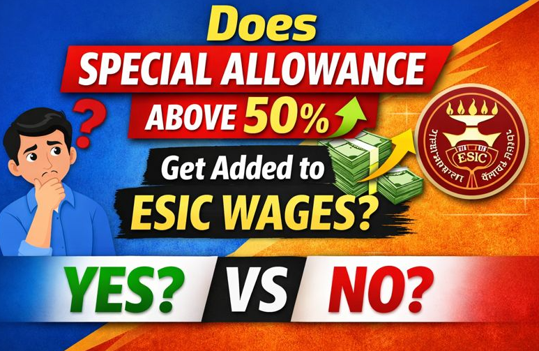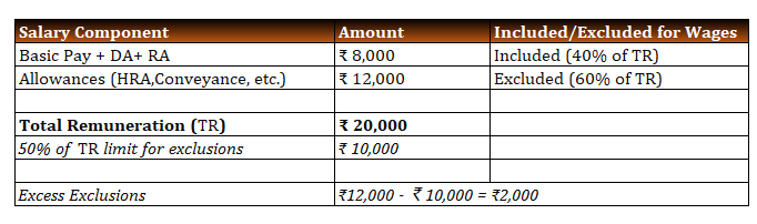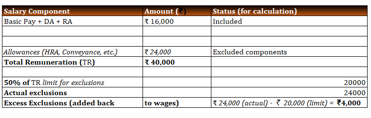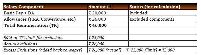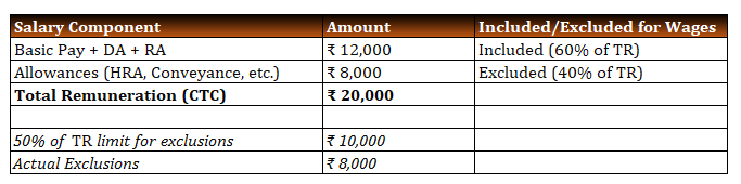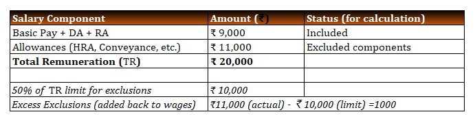 In this case, the actual exclusions (₹8,000) are less than the 50% limit ₹10,000). The ESI “wages” for calculation are the actual included components: