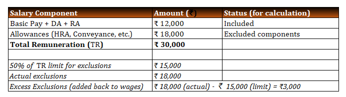 Here, the actual exclusions (₹12,000) exceed the 50% limit (₹10,000) by ₹2,000. This excess amount must be added back to the “wages”: